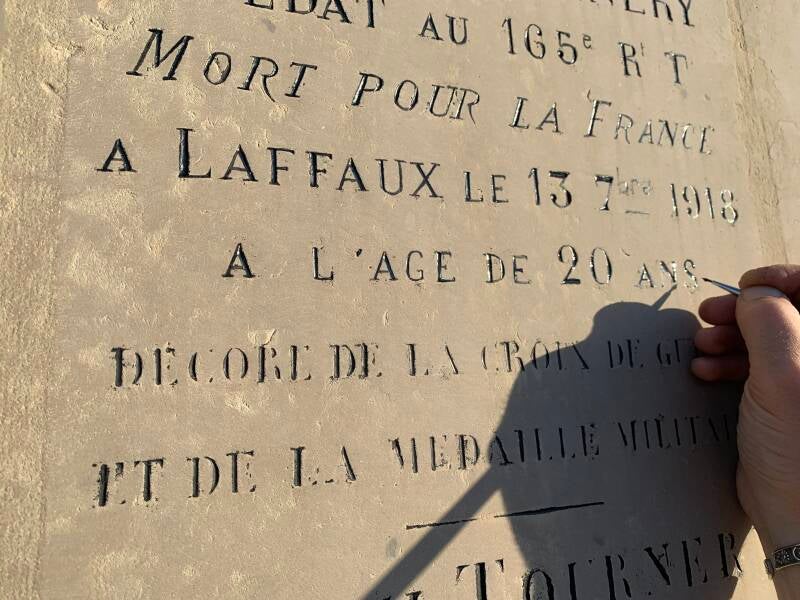 - Préparation des inscriptions : Les gravures sont souvent légèrement poncées pour enlever les résidus de peinture ancienne ou d'éventuelles dégradations superficielles.