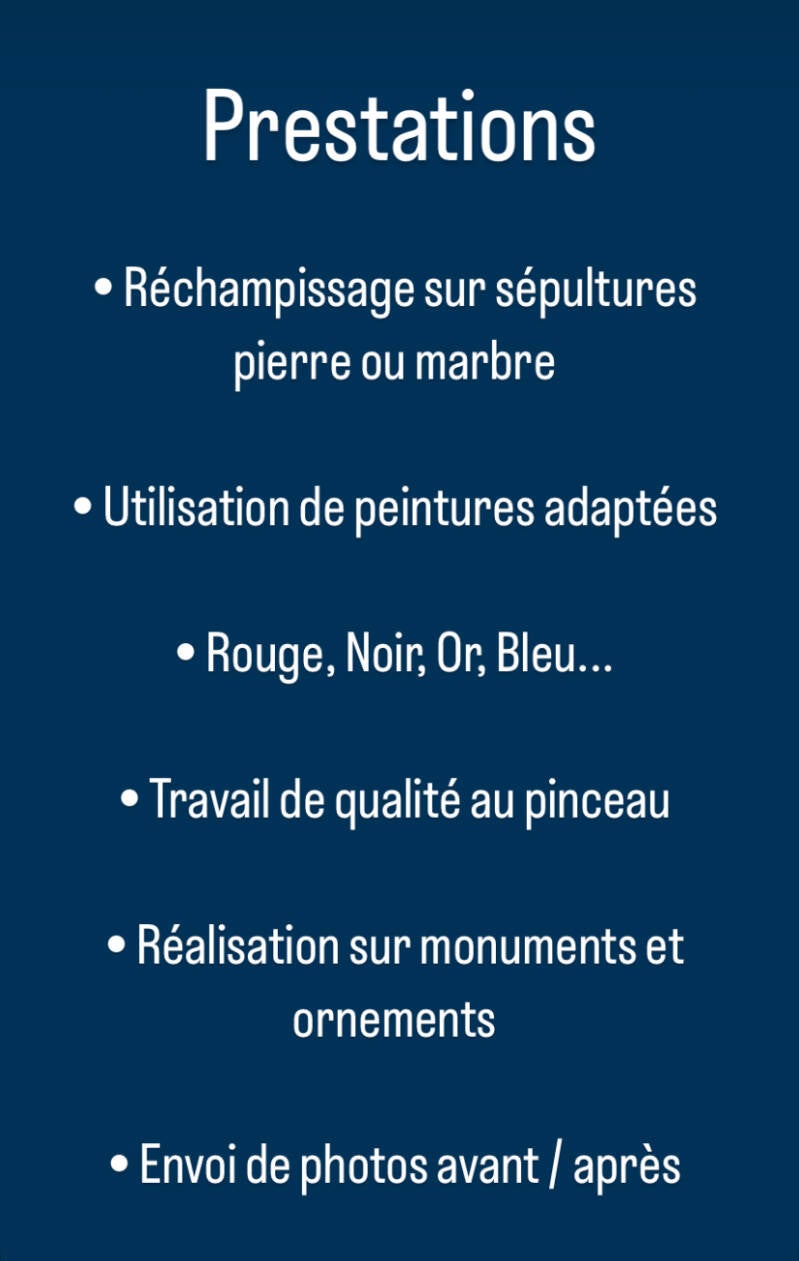 - Application de la peinture : Une peinture spéciale, généralement résistante aux intempéries, est appliquée sur les gravures. Le choix de la couleur (noir, doré, argenté, etc.) dépend des préférences et de l'aspect initial de la pierre tombale.